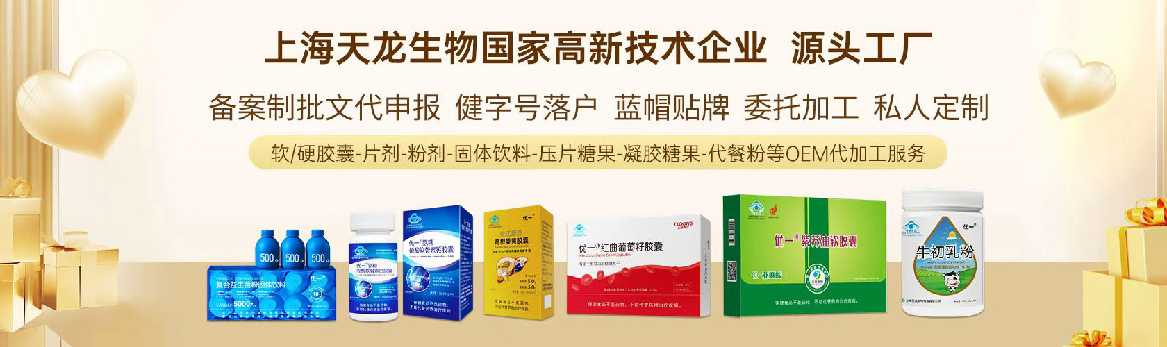 找到我们 • 就找到了源头 上海天龙生物科技有限公司是一家以推进中国生物产业发展为使命,致力于大健康食品、保健食品、营养补充剂、特殊膳食营养食品的研发、生产、销售为一体的技术企业。公司获得国家级高新技术企业、上海保健品行业协会理事单位,互动百科2018最具影响力企业等荣誉。 公司成立至今已有20年,具有成熟的销售网络和营销体系,总部设在上海,下设威海生产基地,销售网络覆盖多个城市和地区。公司与国内各大研究机构及高校紧密合作,研发团队经验丰富,拥有工程师等研发人员。至今为止,我们研制开发出了保健食品和特殊膳食营养食品、营养补充剂、SC食品各大系列100+品种,已申请保健食品批近50+,拥有100+个特膳/SC食品,3000+种原料数据库。 公司凭借在业内良好的品牌口碑、严格的质量管控,成熟的研发团队及制造工艺、不断强化在营养保健食品领域的竞争力与影响力,并在威海市投资建设了保健食品GMP加工基地,拥有软胶囊、胶囊、片剂、粉剂、固体饮料、压片糖果、凝胶糖果等多条生产线。 上海天龙生物科技有限公司本着“品质优一,健康优一”的企业宗旨,以“促进国民健康素养”为已任,以研发创新为导向,紧跟市场发展趋势,积极开发并提供更好品质的多元化保健食品、营养类健康食品,不断巩固并强化在营养保健食品制造领域的口碑及影响,通过持续研发、科学配比、让您遇见营养的美好!